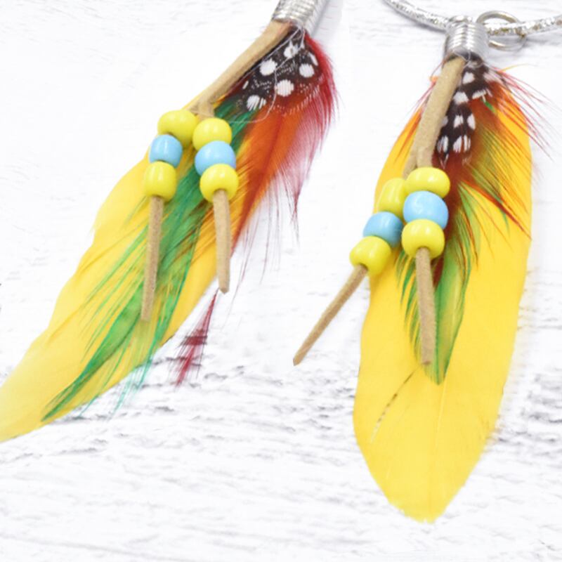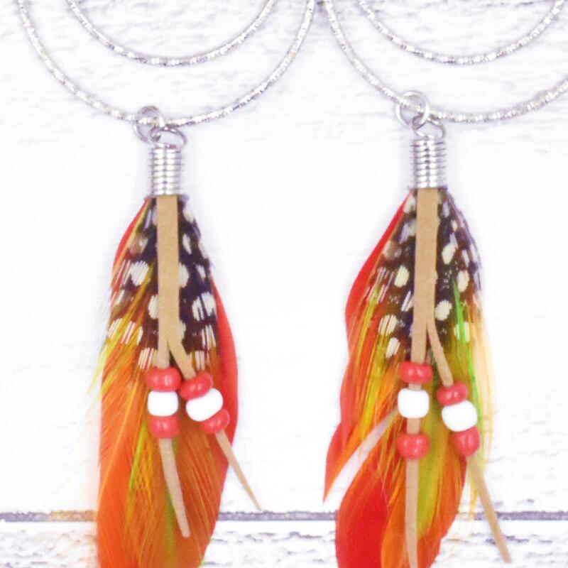 それと合わさるように茶色ベースの羽とビーズ、革のストラップがついています。