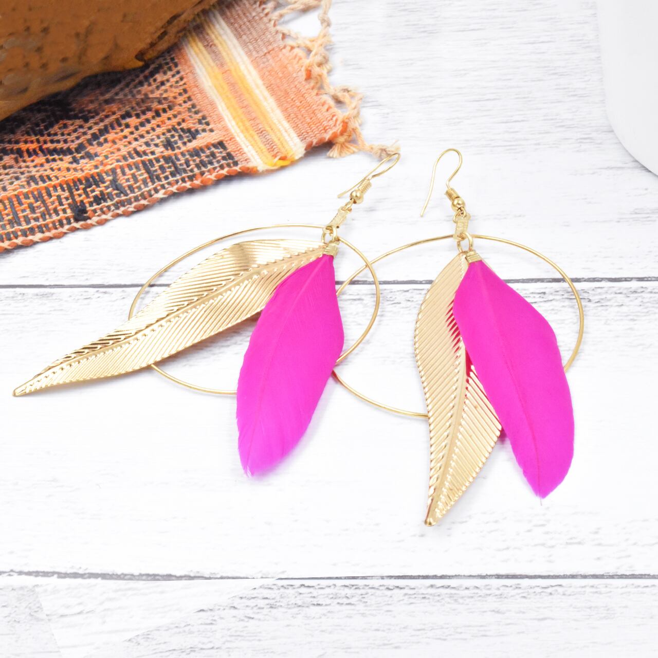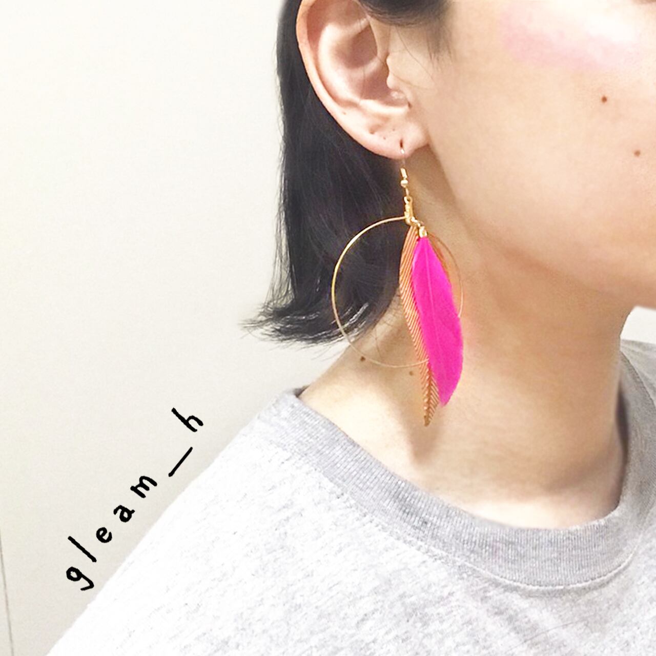 繊細なゴールドの葉と大きめのルーフそして鮮やかなお色の羽ととてもゴージャスながら落ち着いたシンプルなデザインです。揺れるとカランと微かに音が聞こえてさらに魅力的でとても映えるピアスです。