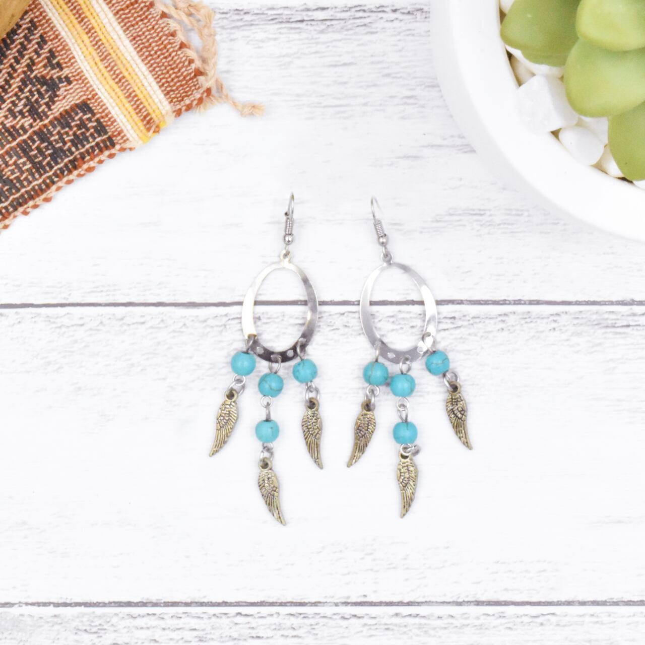 シルバーの繊細な羽とターコイズカラーのビーズがとても印象的なピアスです。